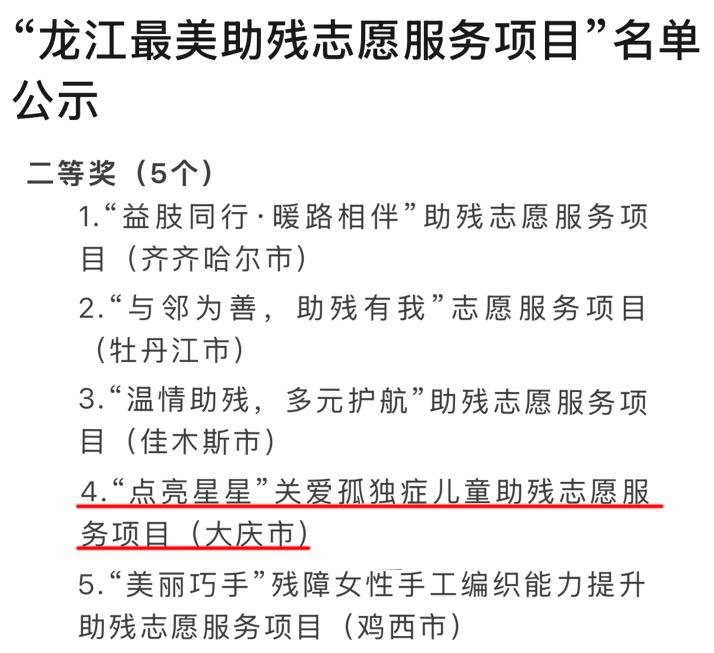 近日,2025年“龙江最美助残志愿服务项目”征集活动评选结果正式公示,我校“点亮星星”关爱孤独症儿童助残志愿服务项目,在全省68个申报项目中脱颖而出,荣获二等奖。此次活动由黑龙江省残联、省委社会工作部、省文明办联合主办,旨在挖掘紧贴残疾人需求,示范性与实效性兼具的助残志愿服务品牌,此次获奖是对我校多年来深耕孤独症儿童关爱领域工作的高度认可。
