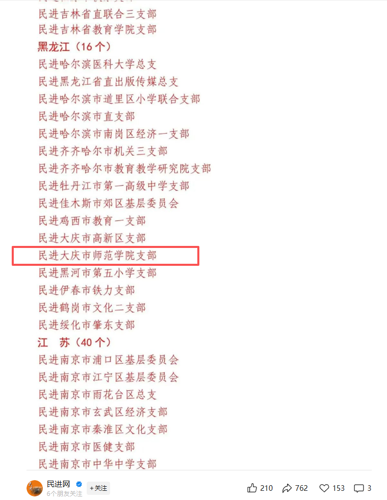 其中,我校民进大庆市师范学院支部荣获民进全国先进基层组织称号。