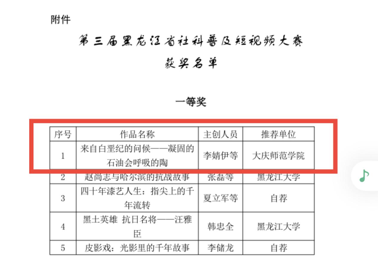 近日,第三届黑龙江省社科普及短视频大赛评选结果揭晓,美术与设计学院李婧伊主创团队的作品《来自白垩纪的问候----凝固的石油会呼吸的陶》凭借独特创意与深刻内涵,从众多参赛作品中脱颖而出,荣获大赛一等奖。