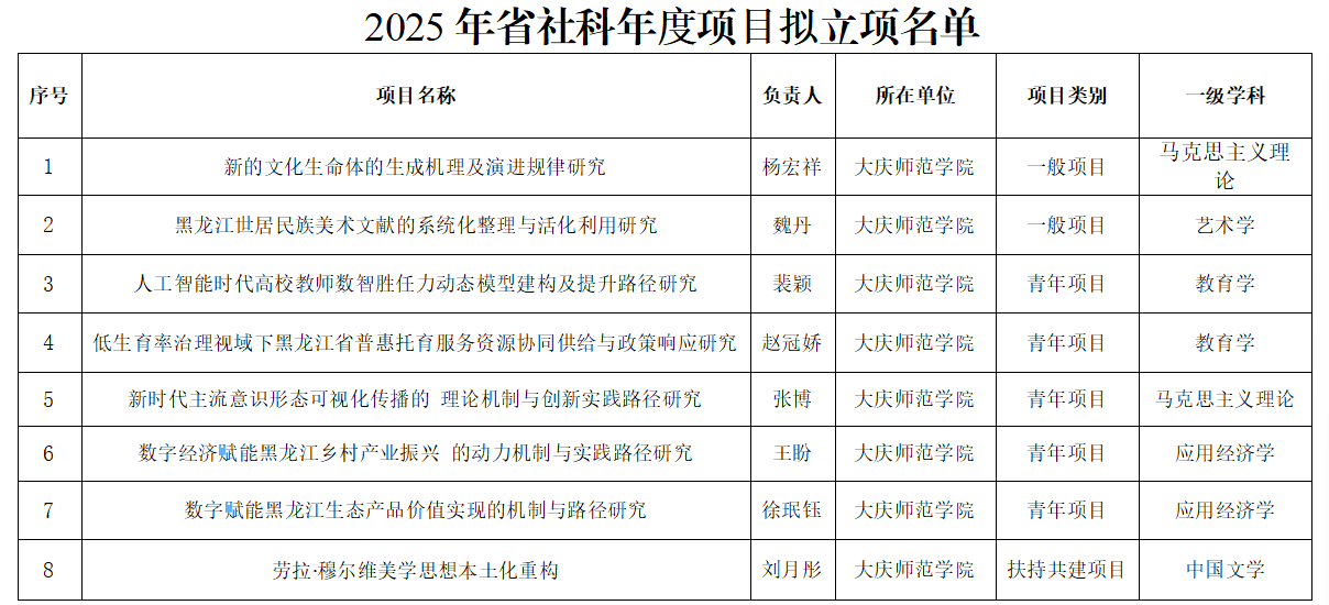 近日,黑龙江省多项省级人文社科类课题立项名单陆续公布,包括《2025年黑龙江省社科研究规划项目拟立项名单》《2025年黑龙江省艺术科学规划项目立项名单》《2025年黑龙江省文化和旅游科研课题立项名单》,以及黑龙江省社会科学界联合会发布的《2025年黑龙江省经济社会发展重点研究课题县(区)立项公告》《2025年黑龙江省经济社会发展重点研究课题(外语专项)立项公告》《2025年黑龙江省经济社会发展重点研究课题(基地专项)立项公告》。