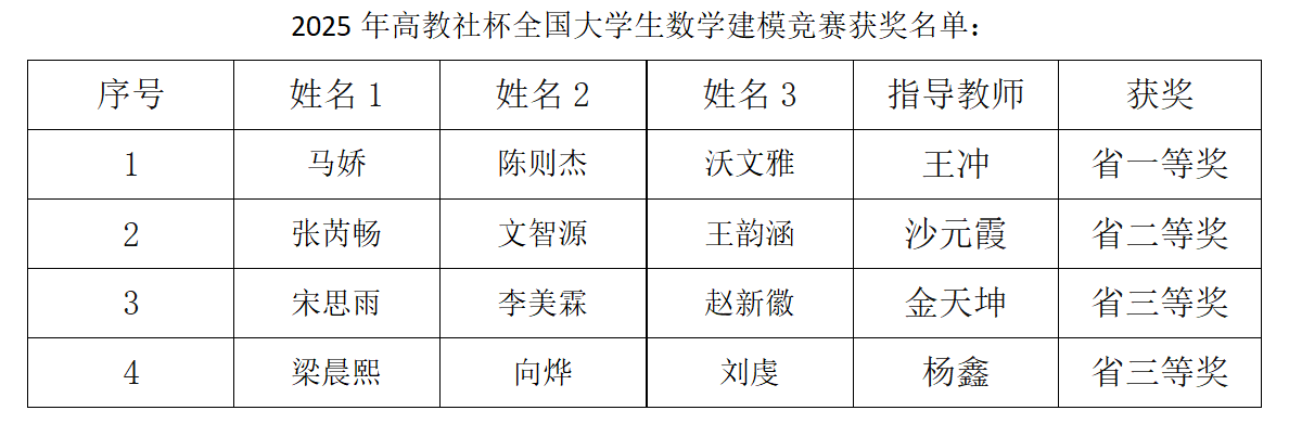 此次优异成绩的取得,将对我校进一步完善数学建模竞赛培育机制、推动数学建模与专业建设的深度融合、落实数学建模核心素养培养路径、全面提升学生跨学科综合应用能力等方面,起到积极的促进作用。(来源:数学科学学院 撰稿:蔡银屏 审核:高扬 编辑:姜丰翼)