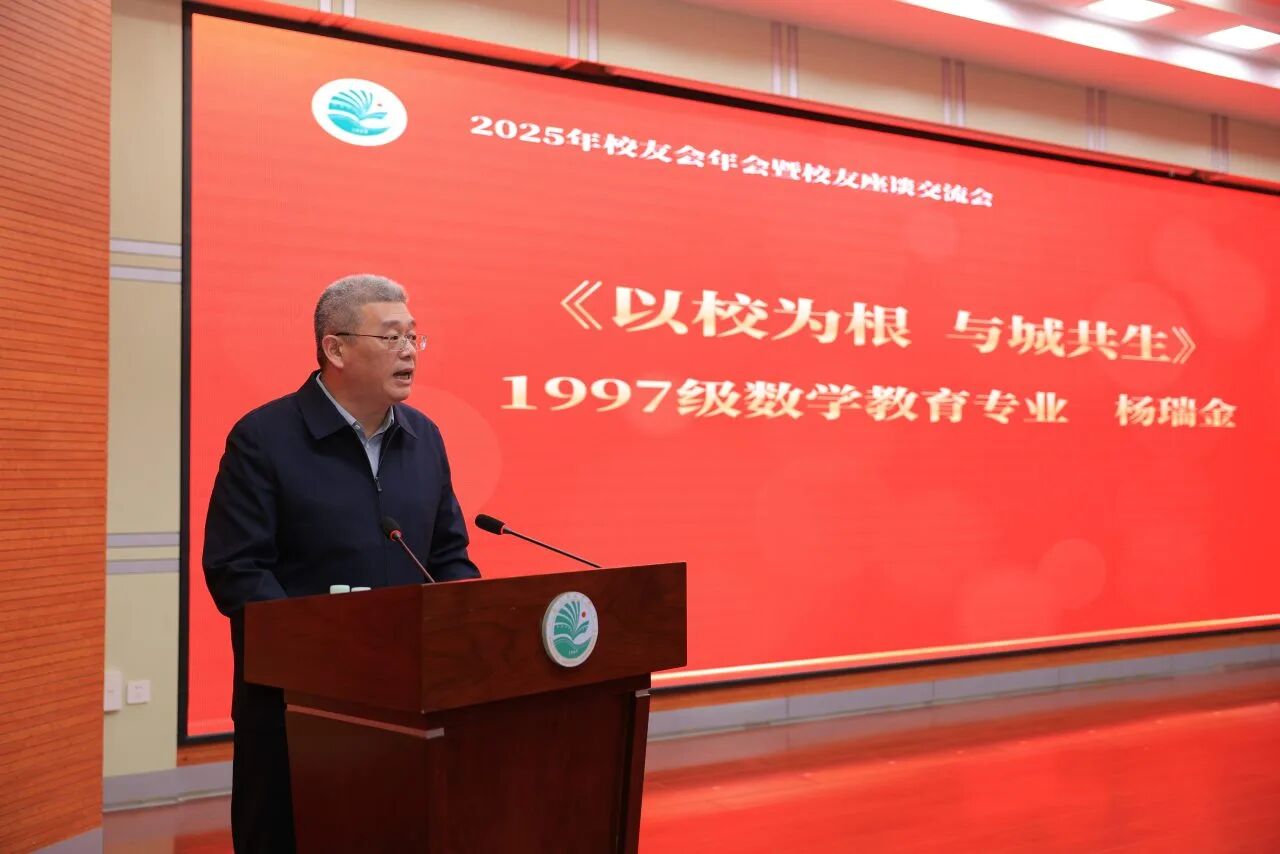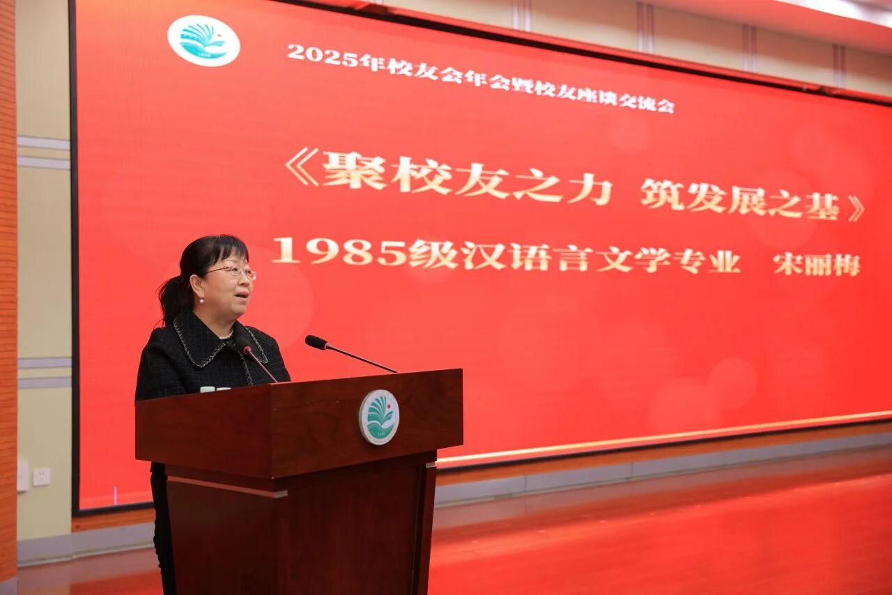 黑龙江省大庆师范学院校友会会长、学校办公室主任杜树祥作工作报告,全面总结校友会规范化建设成效、60周年校庆系列活动成果、校地企合作签约进展,以及全国22个校友会联络体系建设情况,并明确了未来工作方向:常态化开展校友活动、完善区域校友会布局、打造校友宣传交流平台,持续夯实校友工作基础。座谈交流环节,五位不同领域的优秀校友代表依次登台分享,情真意切、干货满满。大庆市人才工作中心主任、1997级数学教育专业校友杨瑞金以“以校为根 与城共生”为题,用详实数据展现庆师毕业生在大庆各条战线的中坚作用,分享校地人才协同发展的丰硕成果;大庆市外事办主任、1998级英语专业校友胡婷婷围绕“承母校荣光 担时代使命”,为母校国际化办学建言献策,提出健全海外校友联络机制、探索轻资产合作模式等宝贵建议;大庆市校友会会长、1985级汉语言文学专业校友宋丽梅分享校友会“以商养会、以会促商、抱团取暖、共同发展”的实践路径,呼吁全国校友联动资源,助力大庆振兴发展;大庆市乘风第二小学校长、1990级体育专业校友刘庆海以“承庆师底色 扬排球风采”为主题,介绍依托排球特色育人、深化院校协同发展的办学成果;1993级汉语言文学专业校友任岩深耕教育一线27载,聚焦师范人才培养,提出“双导师制”“双技术驱动”等建议,强调理论与实践深度融合,为母校人才培养精准赋能。校友们的分享,既有个人奋斗的成长感悟,更饱含反哺母校、助力家乡的责任担当,赢得现场阵阵掌声。