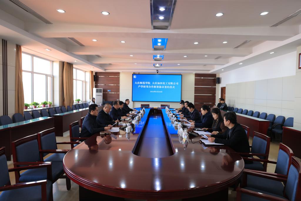 春潮涌动启新程,校企携手谱华章。3月24日,大庆师范学院与大庆油田化工有限公司产学研用合作框架协议签约仪式举行,双方正式开启全方位、深层次、高质量校企合作新篇章,聚力打造高校与石油化工产业产教融合新标杆样板。大庆油田化工有限公司经理李凌晖、总工程师邓发强、东昊公司经理刘青鑫、技术开发研究院院长禹铁军、人事部(党委组织部)主任姜大巍、计划经营部主任宿志刚,大庆师范学院党委副书记、校长张平,副校长许双毅及相关职能部门、化学工程学院负责人等出席仪式,会议由许双毅主持。