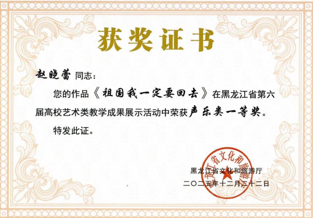 以赛促教攀高峰,以艺育人启新程。此次获奖,既是对我校师生专业能力与创作水平的高度肯定,也是我校长期深耕艺术教育、深化教学改革的生动体现。今后,我校将以此为契机,总结参赛经验,持续强化艺术实践教学,坚持“以赛促教、以赛促学、以赛促创”的育人理念,将学科竞赛与日常教学深度融合,搭建多元化实践平台,注重提升师生的艺术素养与创新能力,鼓励师生深入生活、扎根黑土,创作出更多兼具思想性与艺术性的优秀作品,为黑龙江省艺术教育事业进步贡献力量。(来源:教务处 撰稿:刘文文 审核:张国发 编辑:姜丰翼)